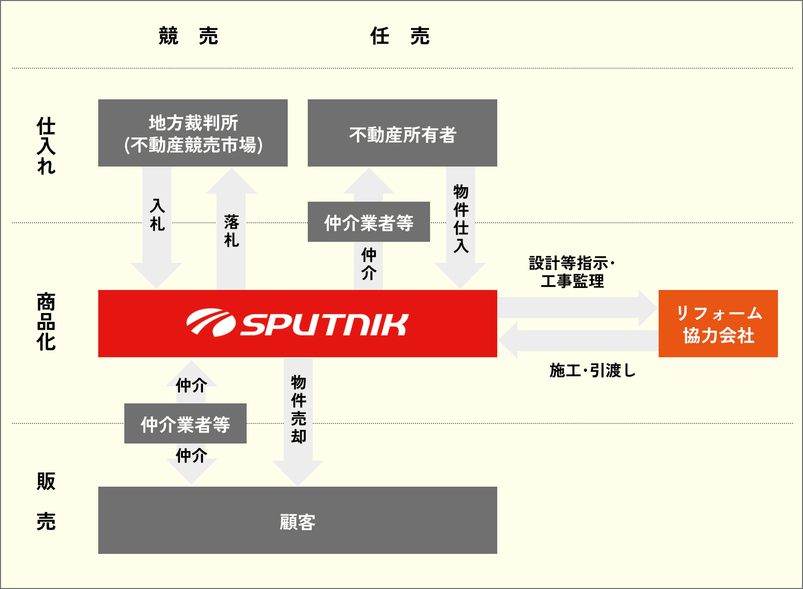 スプートニクの不動産住宅再活事業のコンセプトは次に住まわれるお客様に、ご満足いただける住宅をご満足いただける価格でご提供できるように努めます。